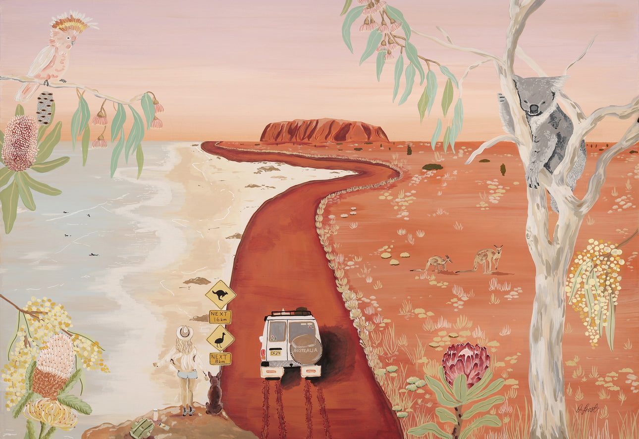 Each artwork in the collection is inspired by a destination that has left a mark on me — whether it’s the golden stillness of the Australian outback, the turquoise waters of the Mediterranean, the snow-dusted slopes of alpine towns, or the sun-soaked energy of Hawaii. From rustic farmsteads to coastal surf scenes, from African safaris to cobblestone villages in Italy, these paintings are layered with memory, story, and sunshine.