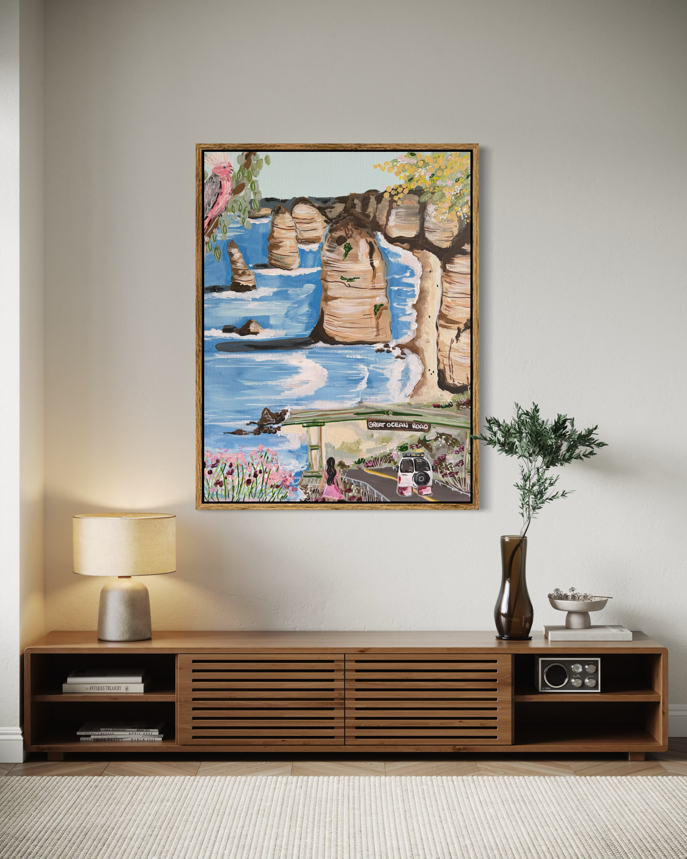 I fell in love with this piece the moment Deli posted it on her page. I knew I had to have it in my home! My fiancé and I love travelling in our car and we have a dream to do a lap around Australia one day, so this piece feels really special to us! The quality of the canvas and the frame is absolutely beautiful. Deli recently customised our piece to include us, our Land cruiser and even our two dogs which made it extra special! We absolutely love it and have had so many compliments from friends and family. We love your work Deli!!