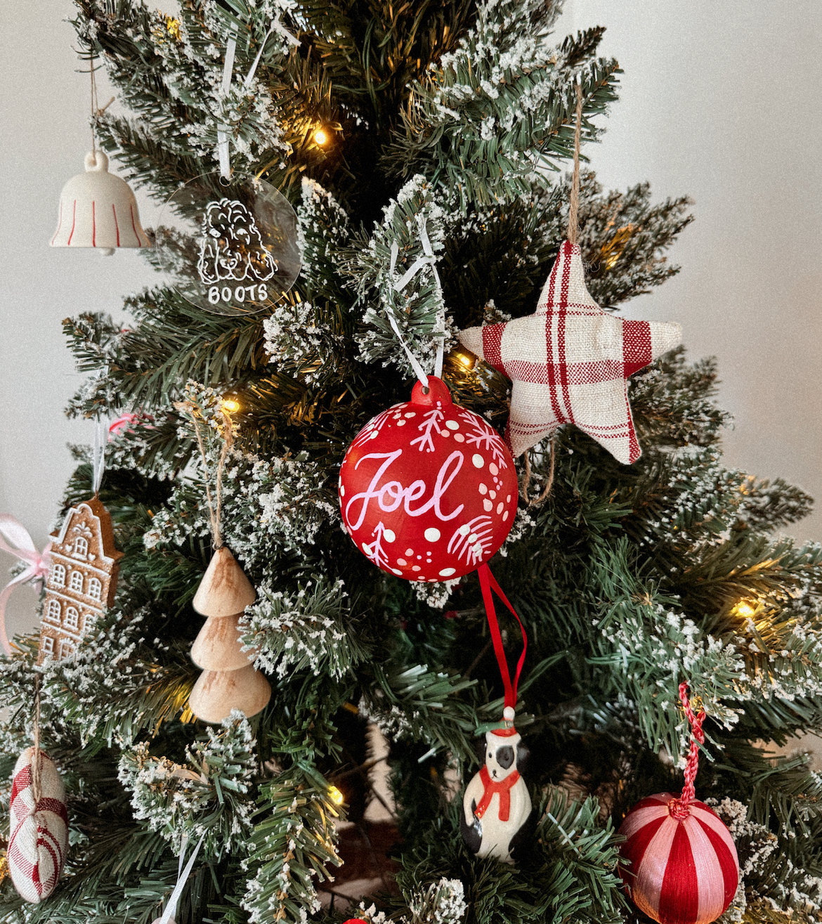 Made to order, they are available in a variety of colours, and include your choice of wording. The artwork on each bauble is not the exact same, they are all hand painted with a Christmas design similar to the pictured.