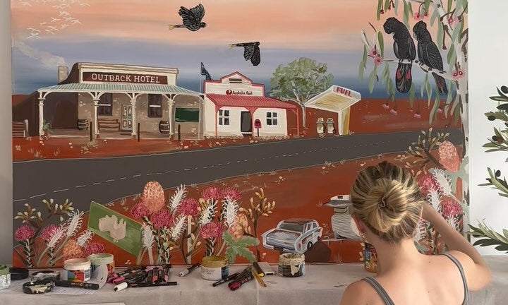Each artwork in the collection is inspired by a destination that has left a mark on me — whether it’s the golden stillness of the Australian outback, the turquoise waters of the Mediterranean, the snow-dusted slopes of alpine towns, or the sun-soaked energy of Hawaii. From rustic farmsteads to coastal surf scenes, from African safaris to cobblestone villages in Italy, these paintings are layered with memory, story, and sunshine.