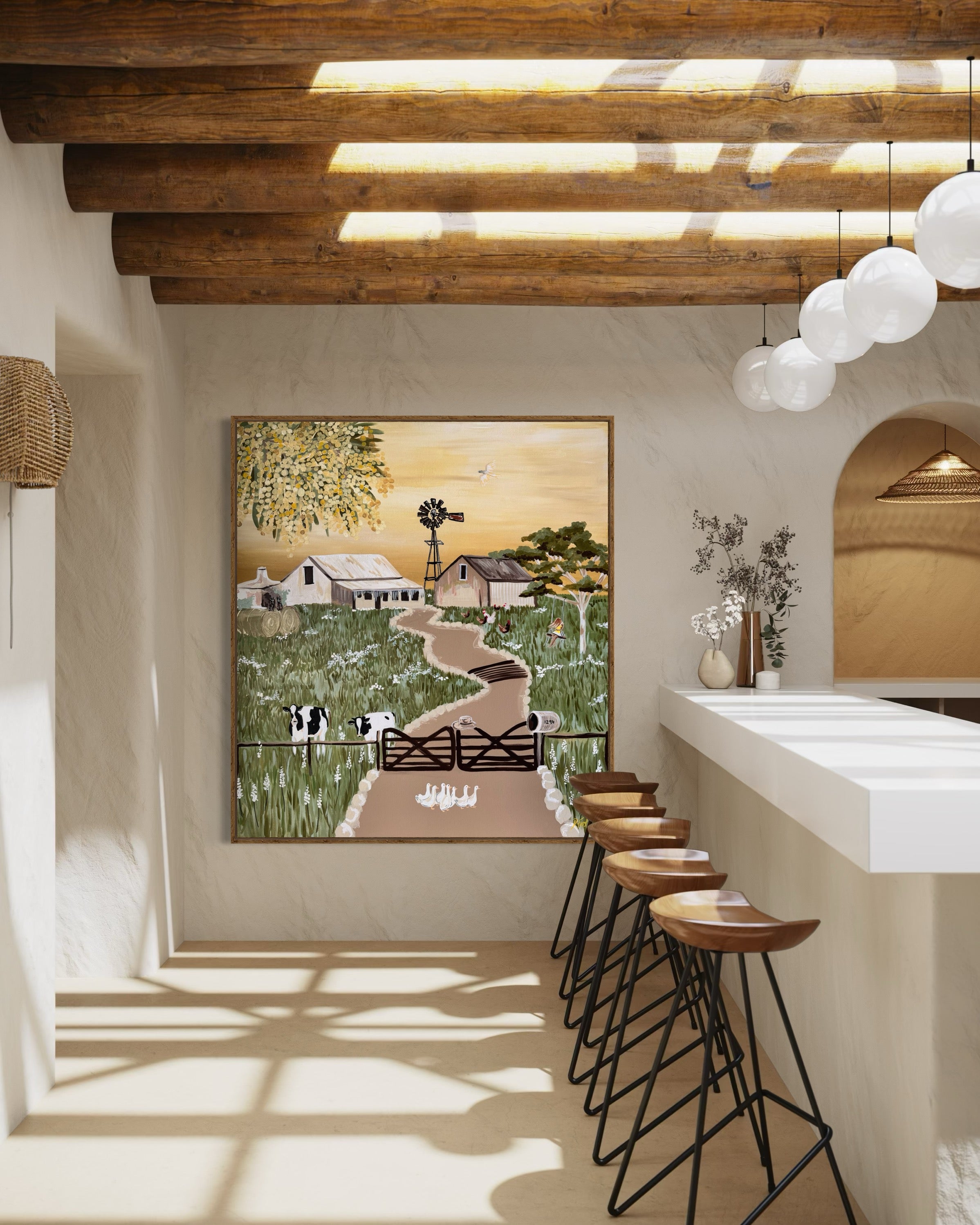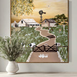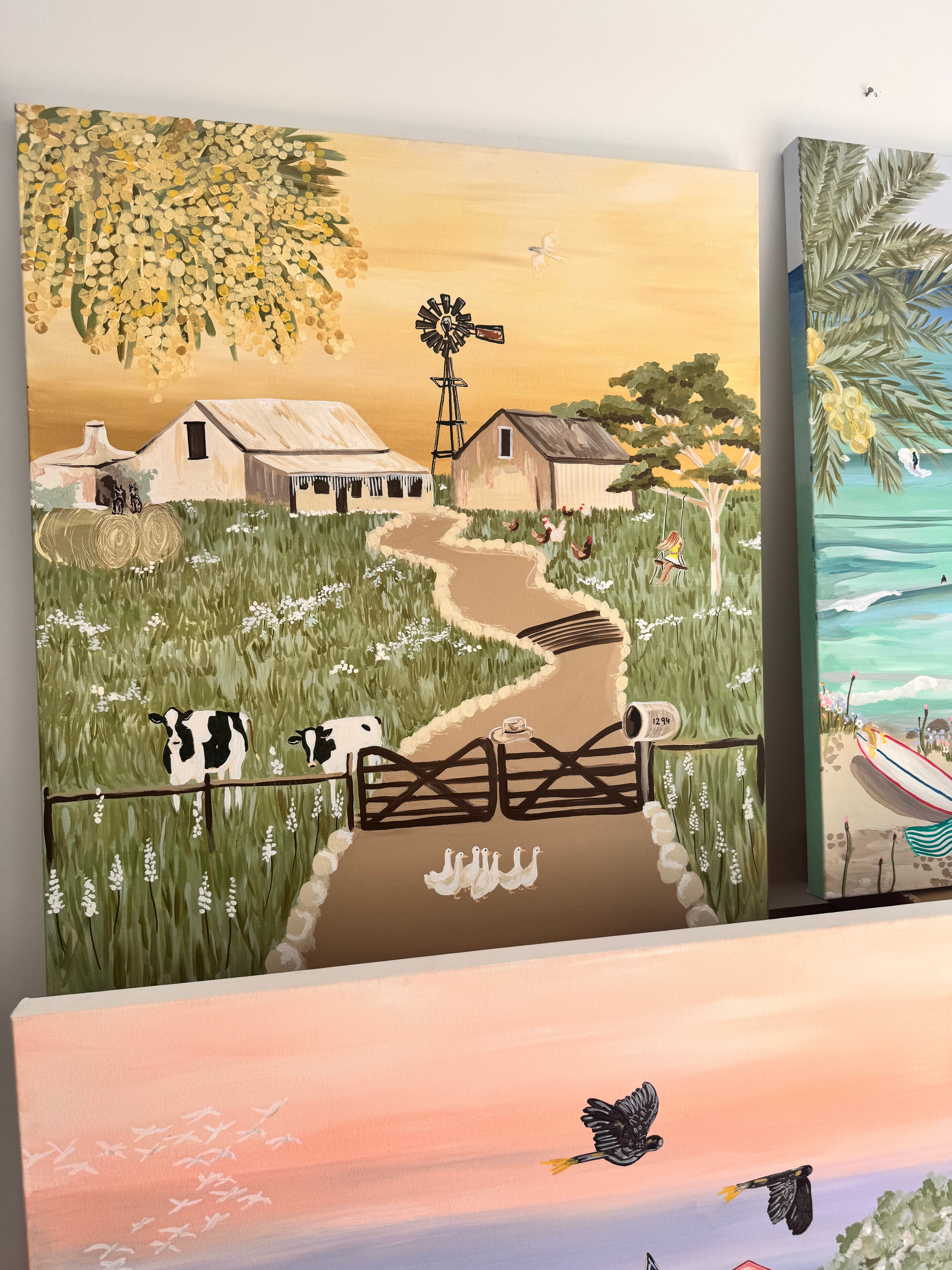 Each artwork in the collection is inspired by a destination that has left a mark on me — whether it’s the golden stillness of the Australian outback, the turquoise waters of the Mediterranean, the snow-dusted slopes of alpine towns, or the sun-soaked energy of Hawaii. From rustic farmsteads to coastal surf scenes, from African safaris to cobblestone villages in Italy, these paintings are layered with memory, story, and sunshine.